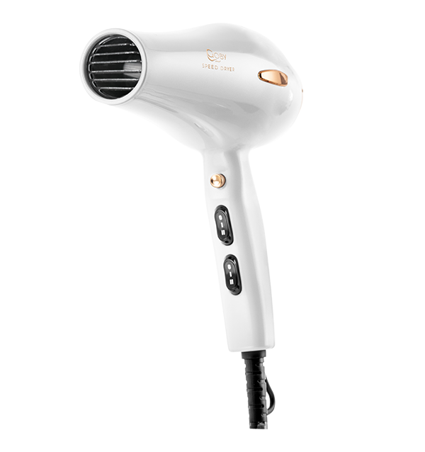 Speed Dryer, per capelli lunghi e folti, silenzioso e leggero, consente una grande comodità d’uso grazie alla sua impugnatura ergonomica ed ai tasti integrati di facile utilizzo. Con protezione contro il surriscaldamento e due diffusori inclusi. Cavo 3mt di lunghezza.